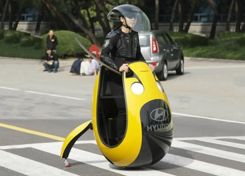 На автосалоне в Сеуле Hyundai представил вариацию на тему сверхкомпактного городского транспортного средства, рассчитанного на одного человека. В этом «яйце» - поскольку «автомобилем» его язык никак не поворачивается назвать, водителю и пассажиру в одном лице придется не только ездить стоя, но и надевать на голову крышу, которое одновременно служит лобовым стеклом.