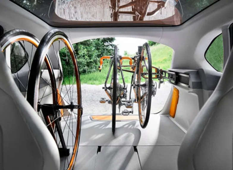 Два велосипеда с демонтированными передними колесами выдвигаются из грузового отделения по специальным рельсам. В случае же отсутствия необходимости брать двухколесный транспорт с собой в дорогу, держатели убираются в стенки багажника, не мешая перевозке других грузов.