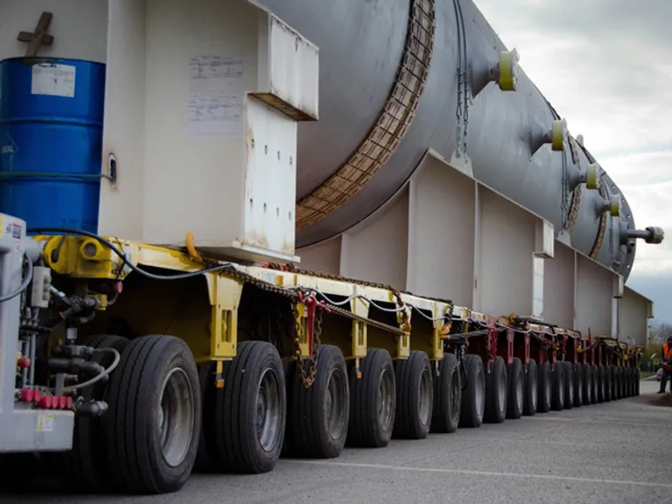 203 километра по федеральной трассе М53 стали самым сложным участком маршрута. Для перевозки реактора массой 1306 тонн и диаметром 7,5 метров был задействован самоходный транспортный модуль. 36-метровая платформа, оснащенная гидропневматической подвеской для плавного хода, имела 384 колеса на 24 сдвоенных осях, которые призваны обеспечить равномерное распределение нагрузки, чтобы не повредить асфальтовое полотно.