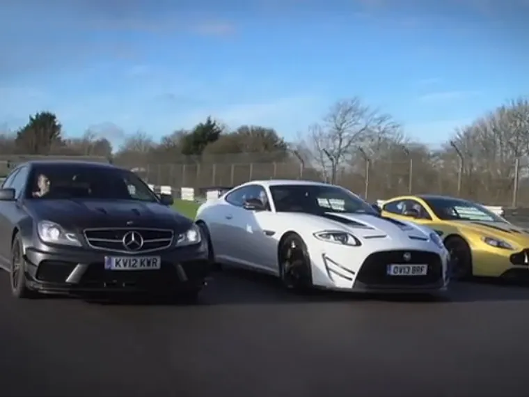 510-сильный Mercedes C63 AMG Black Series против 542-сильного Jaguar XKR-S GT и 565-сильного Aston Martin V12 Vantage S в видеобзоре британского издания Autocar