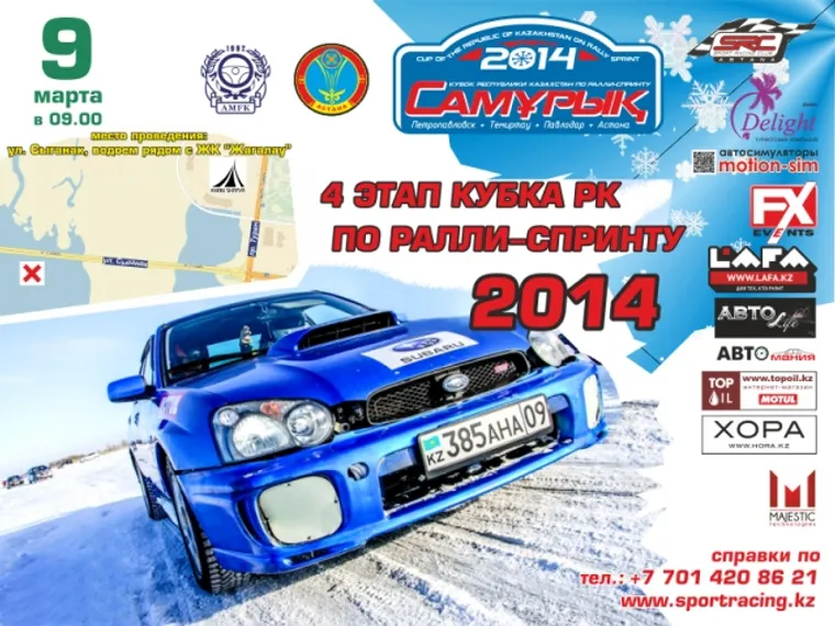 Заключительный четвертый этап Кубка по зимнему ралли-спринту «Самурык 2014» пройдет в городе Астана 9 марта 2014 года на водоеме близ ЖК «Жагалау» в районе ТРЦ «Хан Шатыр» по улице Сыганак. Каждый желающий может заполнить заявку на экипаж, а также создать команду и выслать командную заявку на почту организаторов den21@inbox.ru. Телефоны организаторов: +7 (771) 033-20-01, +7 (777) 750-70-76. Окончание приема заявок - 07.03.2014 до 22:00.
