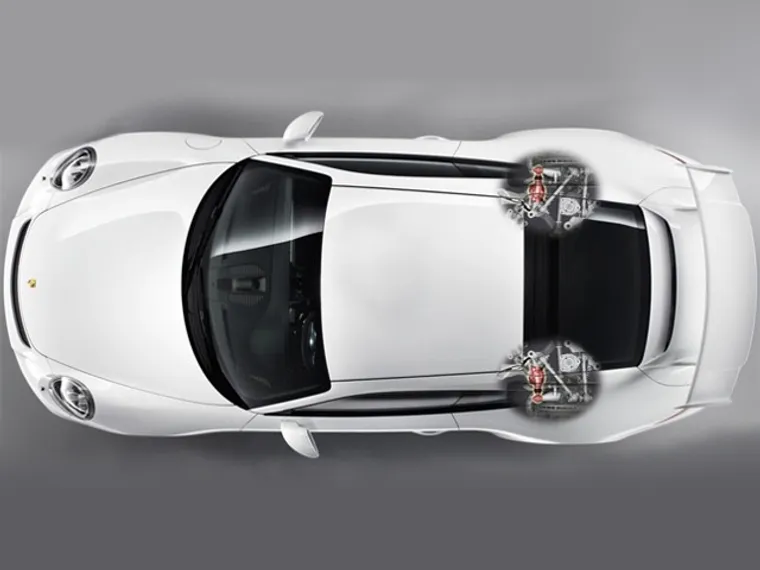 В Porsche объясняют значительное техническое усложнение 911-го желанием обеспечить максимально точное и корректное поведение машины при прохождении поворотов. На скорости до 50 км/ч задние колеса поворачиваются в противоположную сторону, относительно передних, что значительно сокращает радиус поворота. А на скоростях свыше 80 км/ч, система направляет задние колеса в том же направлении, что и передние - это увеличивает устойчивость на высоких скоростях.