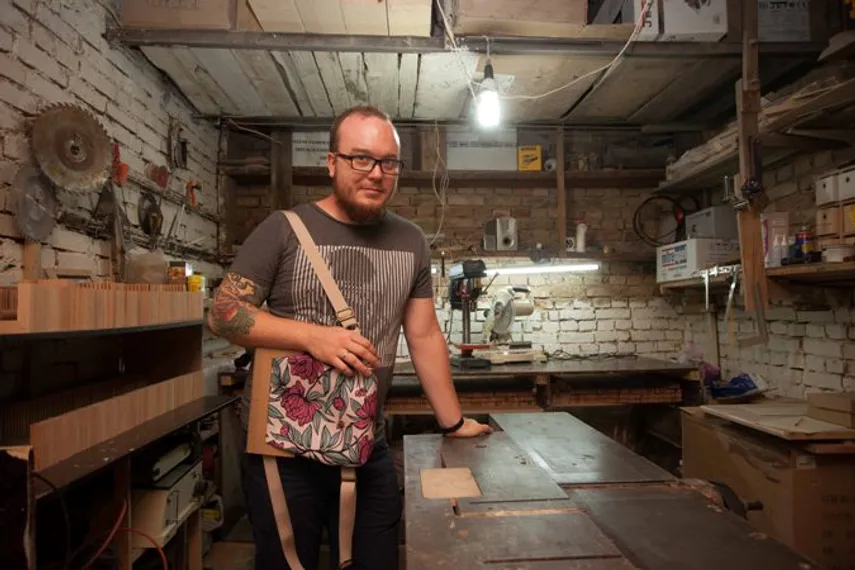 Мы встретились с Ильей Бондариком в девятом часу вечера, потому что его плотный график работы не давал нам шанса увидеться раньше. «Я работаю в одной из телекоммуникационных компаний и параллельно веду наш с супругой бизнес», — уточнил он при встрече. Наша беседа состоялась в одном из гаражей Алматы, в котором производятся фреймы для клатчей и рюкзаков. Илья с супругой Анной уже более трех лет изготавливают самобытные арт-объекты под брендом RedCrow. Уникальность их изделий — необычные принты на ткани, обрамленные массивным текстурным деревом. Корреспондент центра деловой информации Kapital.kz побеседовал с Ильей о том, с чего начинался «сумчатый» бизнес, почему дерево — это особый материал и можно ли сшить качественную сумку только из казахстанского сырья.