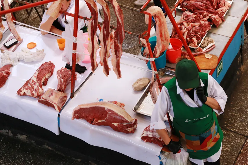 Мясо и мясные продукты подорожали на 5,6% за год. Непосредственно мясо и птица в годовой динамике показали рост цен на 5,1%, колбасы — на 6,1%, изделия из мяса — на 7%. Килограмм говядины можно было купить в среднем за 2,7 тыс. тенге, баранины — за 2,8 тыс. тенге, свинины — за 2,2 тыс. тенге, конины — за 3 тыс. тенге. Куры стоили в среднем 1,5 тыс. тенге за кг, вареная колбаса — 2,9 тыс. тенге, полукопченая — 3,5 тыс. тенге.