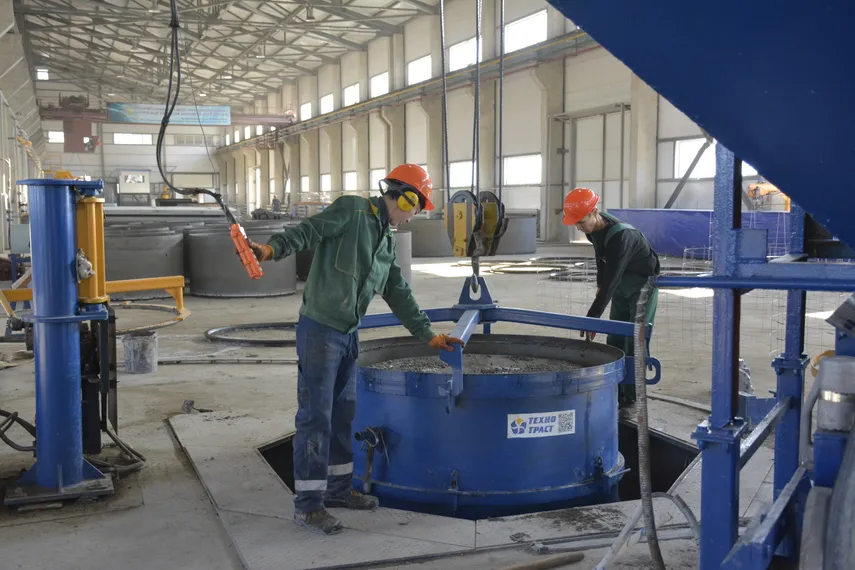 В цехе также есть оборудование — вибропресс для выпуска железобетонных колец диаметром 1,5−2 метра. По словам учредителя, мощность предприятия позволяет производить 50 штук такой продукции в сутки, или 12 тыс. в год. Особый акцент предприятие ставит на наличие линии по производству сборно-каркасных изделий. В последние 2−3 года многие школы строятся именно из них. Также в ассортименте выпускаемой продукции есть опоры для линий электропередач (СВ) и другая продукция.