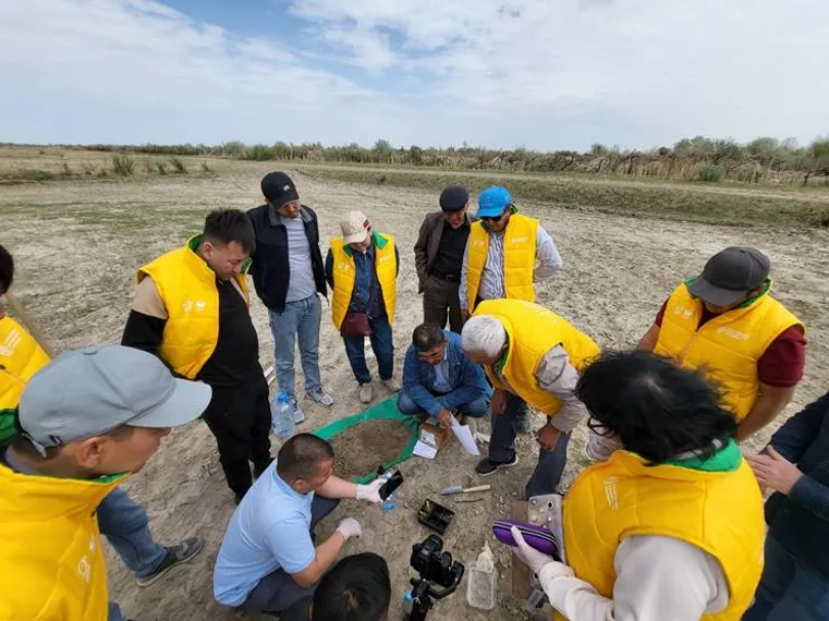 Владимир Заболотских, консультант по управлению рисками засухи и засоления в ФАО Казахстана, проводил практические полевые занятия, где участники учились делать анализ почвы с помощью специальных инструментов и приборов.