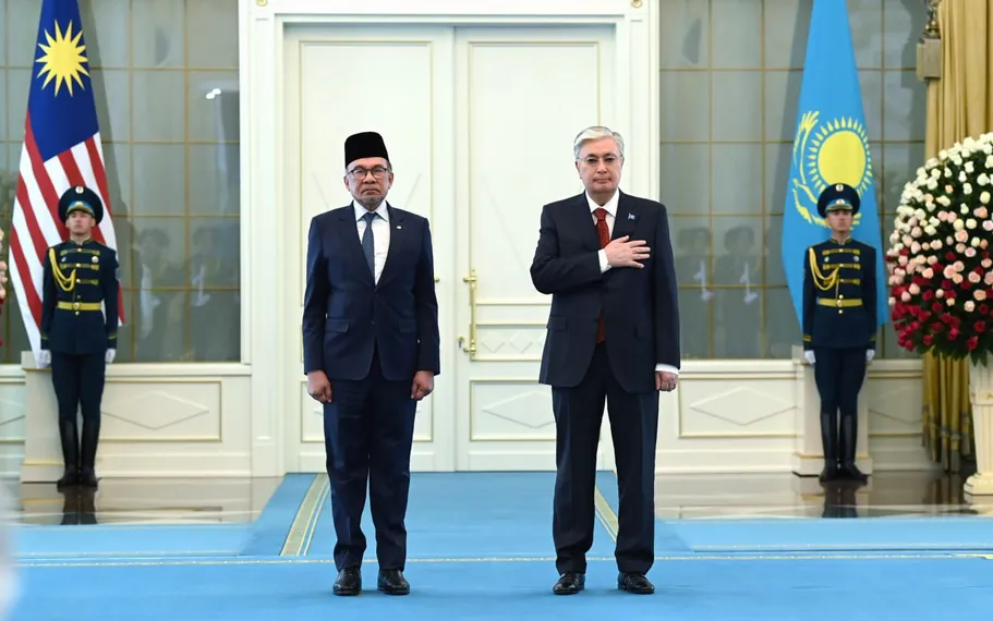 Касым-Жомарт Токаев и Анвар Ибрагим представили друг другу членов официальных делегаций. Начальник роты Почетного караула отдал приветственный рапорт президенту Казахстана и премьер-министру Малайзии, прозвучали гимны двух государств.