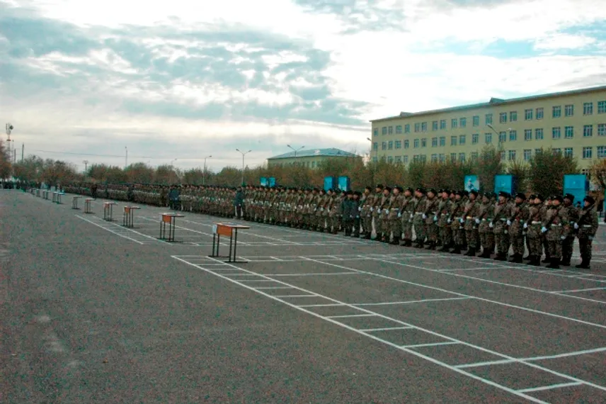 С этого момента ребята официально приняты в ряды Вооруженных сил Казахстана. Они попрощались со своими родными на год и впервые единым строем прошагали по плацу войсковой части.