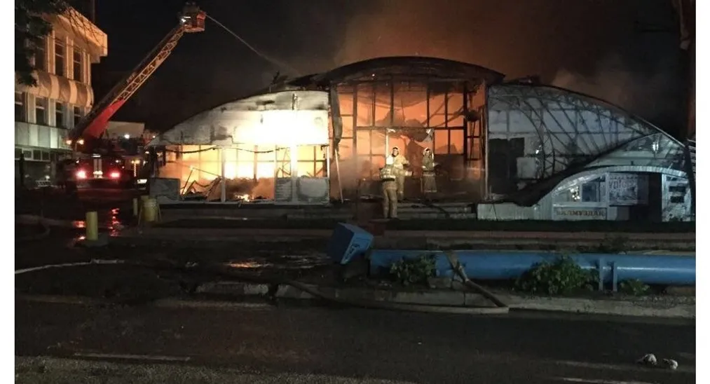 «Горели торговые бутики, выполненные из пластика по реализации овощей, продуктов, одежды, лакокрасочных изделий. В результате пожара взорвался один пропановый баллон. При этом один 50-литровый пропановый баллон и два кислородных баллона в одном из кафе было убрано на безопасное расстояние. Усилиями пожарных спасено здание зоомагазина, аптеки, мясного павильона, магазина «Мечта» и автостоянка», — проинформировал Руслан Иманкулов.