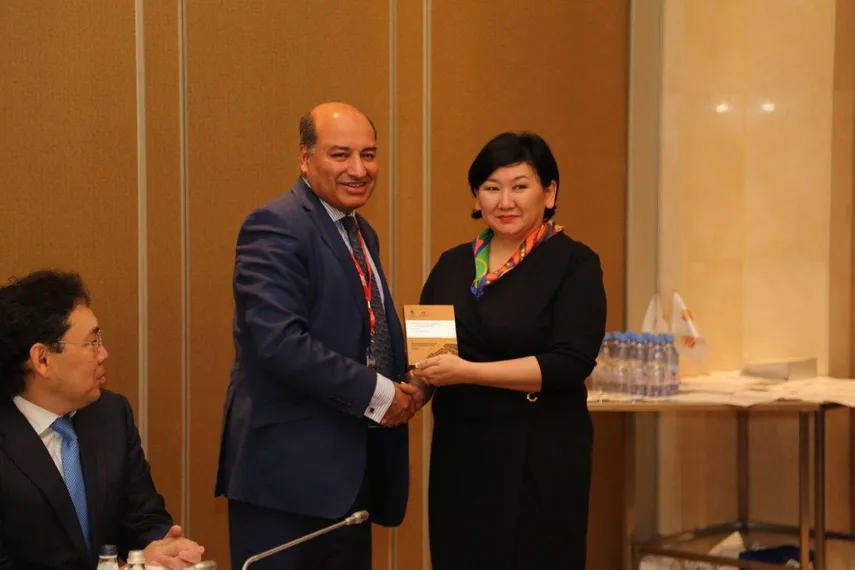 Глава Европейского банка реконструкции и развития (ЕБРР) Сума Чакрабарти вручил заместителю председателя правления холдинга «Байтерек» Ляззат Ибрагимовой награду за продвижение гендерного равенства.