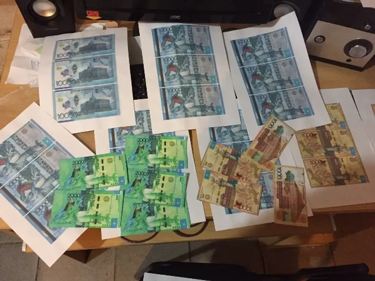 Во время дальнейшей проверки на территории города Алматы была установлена типография, где изготавливались фальшивые денежные средства. В типографии обнаружены и изъяты фальшивые купюры на сумму 25 тыс. тенге, 28 листов формата А-4, на которые были занесены цветным принтером формы купюр номиналами 1000, 2000, 10 000 тенге, специальные бумаги, а также цветные принтеры и компьютеры.