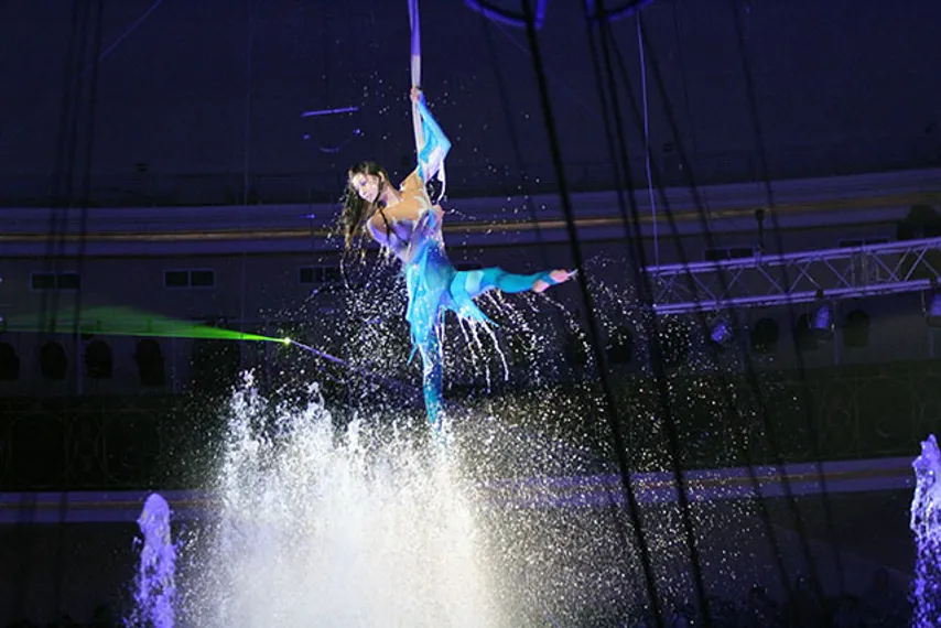«Шоу гигантских фонтанов» побило рекорды по посещаемости в Европе и по праву стало одной из лучших мировых цирковых программ, говорится в тексте. Около 120 тонн воды заливают в бассейн, чтобы осуществить задумку с поющими фонтанами и сотворить незабываемое шоу на арене цирка.600 фонтанов, самый большой из которых бьет на высоту купола цирка (22 метра).
