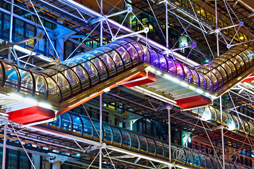Открытая 31 января 1977 года причудливая постмодернистская постройка вызвала немало споров и нареканий. Здание представляющее собой прямоугольный ангар, опоясанный огромными разноцветными трубами. Каждый отдельный цвет труб цвет имеет свой код: синий - вентиляция, зеленый - водопровод, желтый - электричество, красный - эскалаторы и пассажирские лифты, поражает воображение. Наружные стены Центра Искусства и Культуры абсолютно прозрачны, а внутренние перегородки - съемные.
