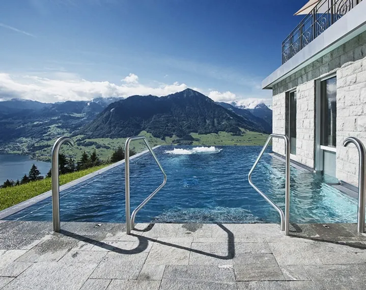 Строительство бассейна на крыше 57-этажного отеля Marina Bay Sands обошлось заказчикам в 80 миллионов долларов США. В такую сумму были оценены 200 000 тонн нержавеющей стали, ушедшие на его создание. Благодаря уникальному устройству бассейна, у пловцов неизбежно возникает ощущение, что они находятся на краю обрыва, а вода плещется через край. Это, конечно же, обман зрения. Никакой опасности для отдыхающих нет, конструкция Из бассейна высокогорного швейцарского отеля открывается роскошный вид на Фирвальдштетское озеро и горы, покрытые ледяной коркой. Поскольку благоприятным для купания температурным режимом Швейцария туристов не радует, бассейн снабжен системой подогрева. А вот размеры купальни скромны: видимо, все же мало кто отваживается провести там больше нескольких минут.