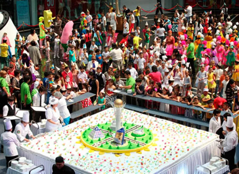 Над созданием кулинарного шедевра более 11 часов трудились 10 специалистов. Торт будет разрезан на 25 тысяч кусков, которые после церемонии смогут попробовать и все желающие посетители ТРЦ «Хан-Шатыр».