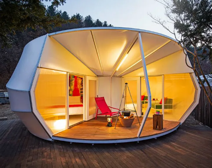 Палатки, придуманные дизайнерской студией ArchiWorkshop, находятся в одном из кэмпингов в Южной Корее. Специальная двойная тканевая оболочка защищает постояльцев от ультрафиолетовых лучей и дождя. В каждом тенте есть сделанные по заказу диваны-кровати и отдельные туалеты. На стенах висят работы корейских художников. Здесь приятно посидеть на террасе вечером со стаканчиком чего-нибудь горячительного или прохладительного, наблюдая, как подрумянивается на гриле мясо. Свежий воздух, природа и надежное пристанище – что еще человеку для счастья надо?