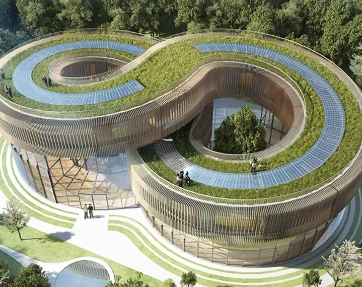 Второй называется The Mountain Villa («горная вилла»). Эти виллы выгибаются огромной дугой и отдаленно напоминают китайский вентилятор или веер. Сделаны конструкции из дерева и фотогальванического стекла, а покрыты они водорослями, которые производят биоводород.