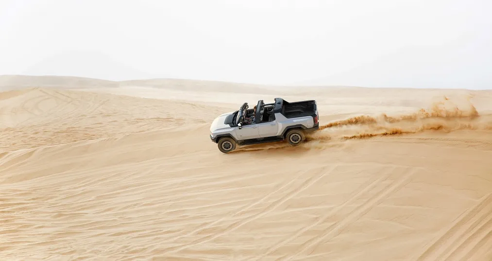 Опционная пневмоподвеска с адаптивными амортизаторами позволяет регулировать дорожный просвет в диапазоне 147 мм. В стандартном режиме пикап имеет дорожный просвет 257 мм, углы въезда и съезда - 41,5 и 31,6 градуса соответственно, глубина преодолеваемого брода - 660 мм. Во внедорожном режиме Terrain Mode клиренс увеличивается до 302 мм, углы въезда и съезда - до 44,3 и 33,7 градуса, глубина брода - до 711 мм. При этом сохраняется штатный ход подвесок в 330 мм, а управление тягой осуществляется только педалью акселератора: при ее отпускании машина останавливается. Самый экстремальный Extract Mode доступен за доплату. В нем Hummer выбирает весь ход подвески: дорожный просвет достигает 404 мм, углы въезда и съезда - 49,7 и 38,4 градуса, глубина брода - 813 мм. Электромобиль может заехать на вертикальный уступ высотой 460 мм и взять 60-процентный подъем как передним, так и задним ходом. Главное, чтобы хватило сцепных свойств внедорожных шин Goodyear Wrangler Territory MT внешним диаметром 35 или 37 дюймов.