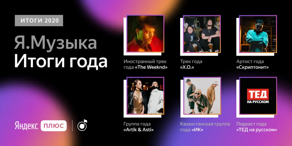 Самым популярным иностранным треком стал «Blinding Lights» (The Weeknd), а первое место среди русскоязычных песен заняла «X.O.» (Andro); лидером среди исполнителей в 2020 году стал казахстанский рэпер Скриптонит, ему же принадлежит звание лучшего альбома «2004». Самой прослушиваемой группой оказался поп-дуэт Artik & Asti, а среди казахстанских коллективов первое место занял проект Ирина Кайратовна. При этом самым популярным треком на казахском языке стал «Әндетемін» (Мирас Жугунусов), а на казахском смешанным с русским - «Дискотека Из 90» (RaiM, Artur, Zhenis).