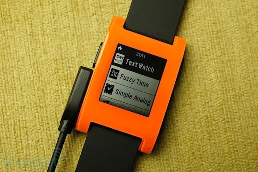 Компактный корпус несет на правой стороне три кнопки - «Вверх», «Вниз» и «Выбор», слева присутствует клавиша «Назад». Кнопки достаточно крупные и с необходимым сопротивлением, препятствующим случайному нажатию. Зарядка Pebble, на которую уходит пара часов, выполняется через небольшую магнитную клипсу.