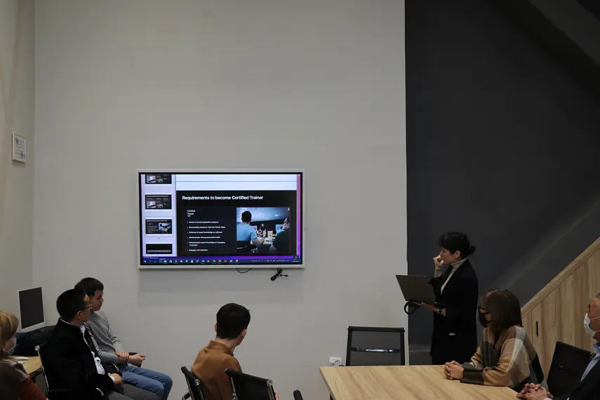 «Я использую Samsung Flip с помощью эйрплей, так как пользуюсь ноутбуком, – говорит Сырым Сейдазимов, преподаватель по разработке ios-приложений в АТУ. – Можно использовать любой компьютер, поддерживающий беспроводное подключение. Я часто использую режим рисования или редактирования для максимальной наглядности».