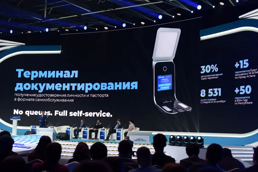 На площадке форума Digital Bridge 2023 председатель правления НАО «Государственная корпорация «Правительство для граждан» Суйениш Абдильдин представил президенту и гостям мероприятия терминал документирования.
