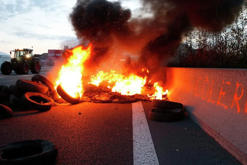 Протестующие перекрывают автострады баррикадами из тракторов, горящих покрышек и куч навоза. Они обыскивают грузовики и, если находят импортное мясо, выбрасывают его на обочину. У супермаркетов города Тарб и молокозавода в городе Вьен фермеры сбросили сотни тонн навоза, а в два супермаркета в департаменте Ло и Гаронна они загнали стада свиней прямо в середине рабочего дня. Заблокирован проезд ко многим достопримечательностям и туристическим объектам. Частные машины фермеры пропускают, но только после тщательного осмотра.