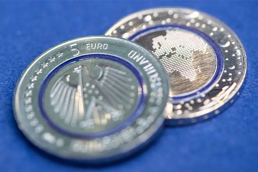 Министр финансов Баварии Маркус Зедер представил новую монету номиналом 5 евро. Как передает РБК, в центре монеты находится голубое кольцо из пластика.
