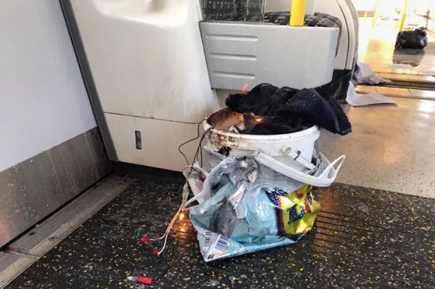 На сайте британского издания The Independent опубликована фотография предмета, который предположительно взорвался, — это полиэтиленовый пакет с пластиковым ведром внутри, из которого торчат провода.