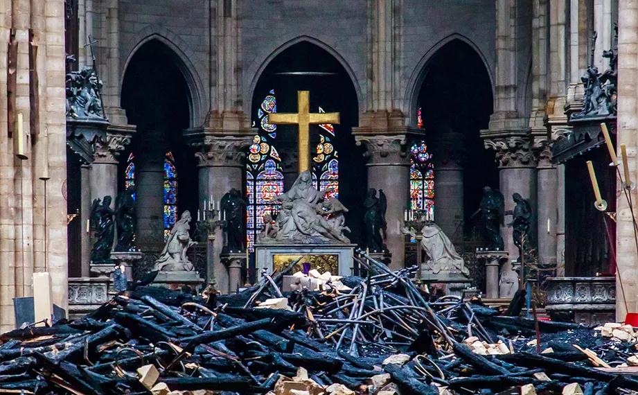 Пожар в соборе начался 15 апреля. В результате обрушились шпиль, часы и большая часть его кровли. Пожарным удалось спасти каркас здания и две башни собора.