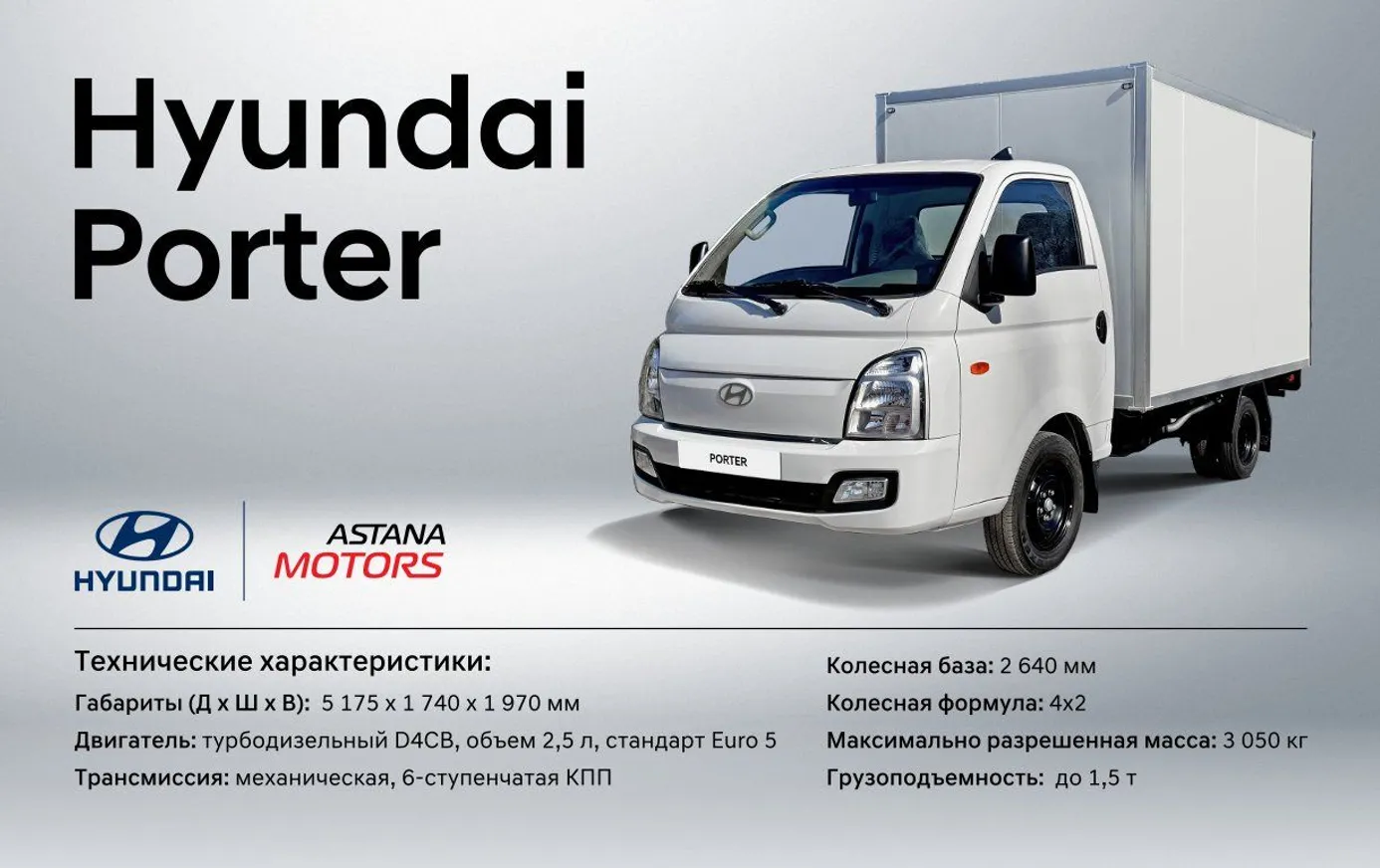 Новую модель грузовика Hyundai Porter презентовали в автоцентре Mycar Almaty. Малотоннажный грузовик выпускается алматинским заводом полного цикла по производству коммерческой, специализированной и пассажирской техники Hyundai Trans Almaty, дочерним предприятием «Астана Моторс».