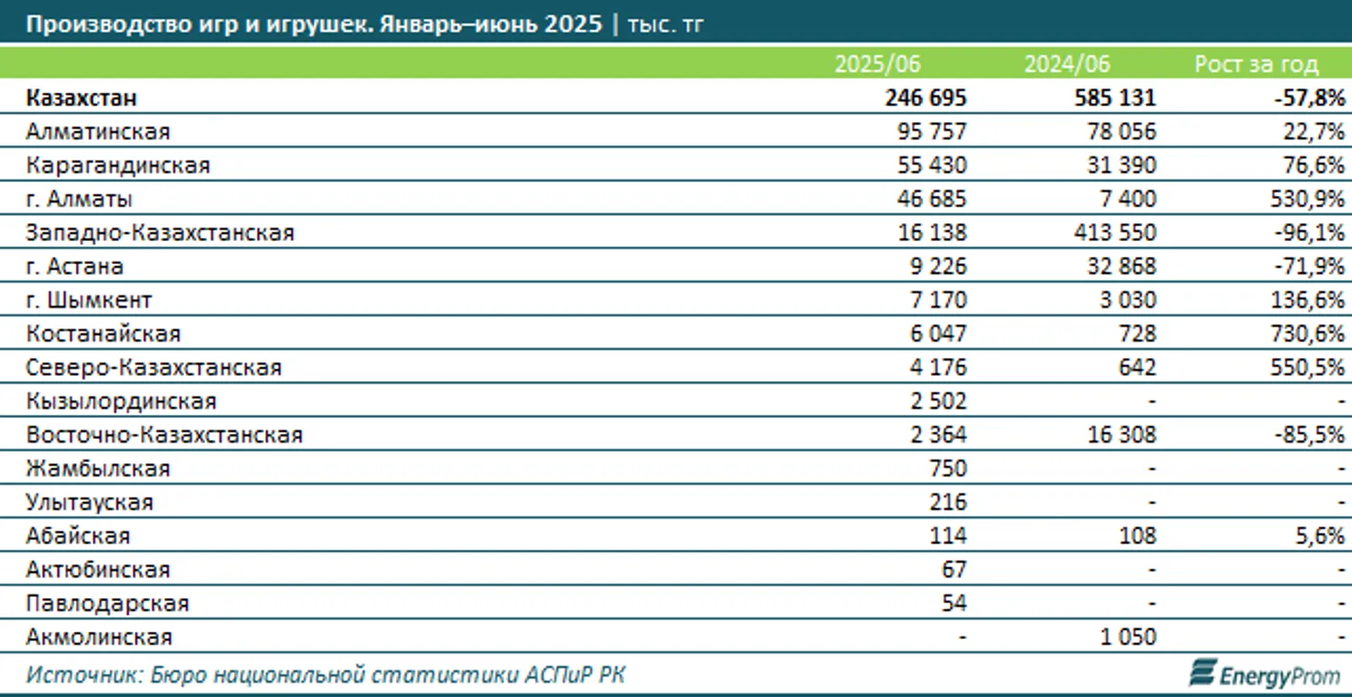 В региональном разрезе лидером по объёму выпуска в секторе стала Алматинская область: 95,8 млн тенге, против 78,1 млн годом ранее. Годовой рост составил 22,7%. На втором месте оказалась Карагандинская область с объёмом производства в 55,4 млн тенге, на третьем – Алматы, где выпустили игрушки на 46,7 млн тенге.