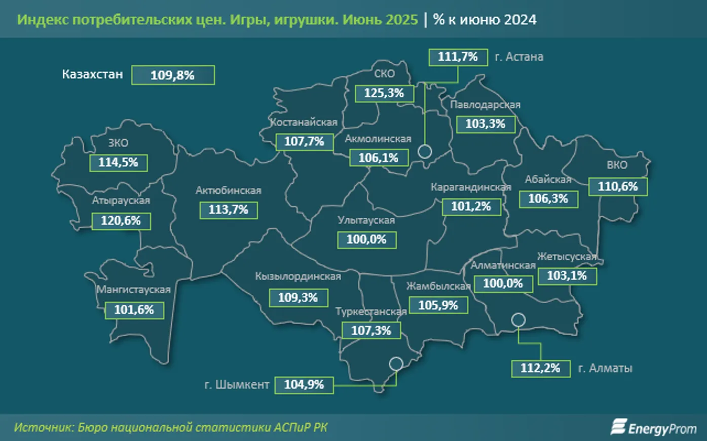 В региональном разрезе наибольшее удорожание в секторе наблюдалось в Северо-Казахстанской области, где стоимость игрушек выросла сразу на 25,3% по сравнению с июнем прошлого года. Помимо этого, существенное увеличение цен было зафиксировано в Атырауской (на 20,6%), Западно-Казахстанской (на 14,5%) и Актюбинской (на 13,7%) областях, а также в Алматы (на 12,2%).