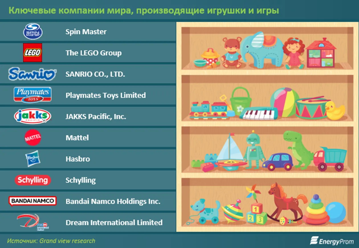 По последним данным, наибольшие доли мирового рынка игрушек и игр приходятся на такие компании, как Spin Master, The LEGO Group, SANRIO CO., LTD., Playmates Toys Limited, JAKKS Pacific, Inc.