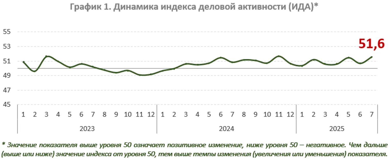 В июле 2025 года деловая активность значительно улучшилась, составив 51,6 (50,7 в июне).