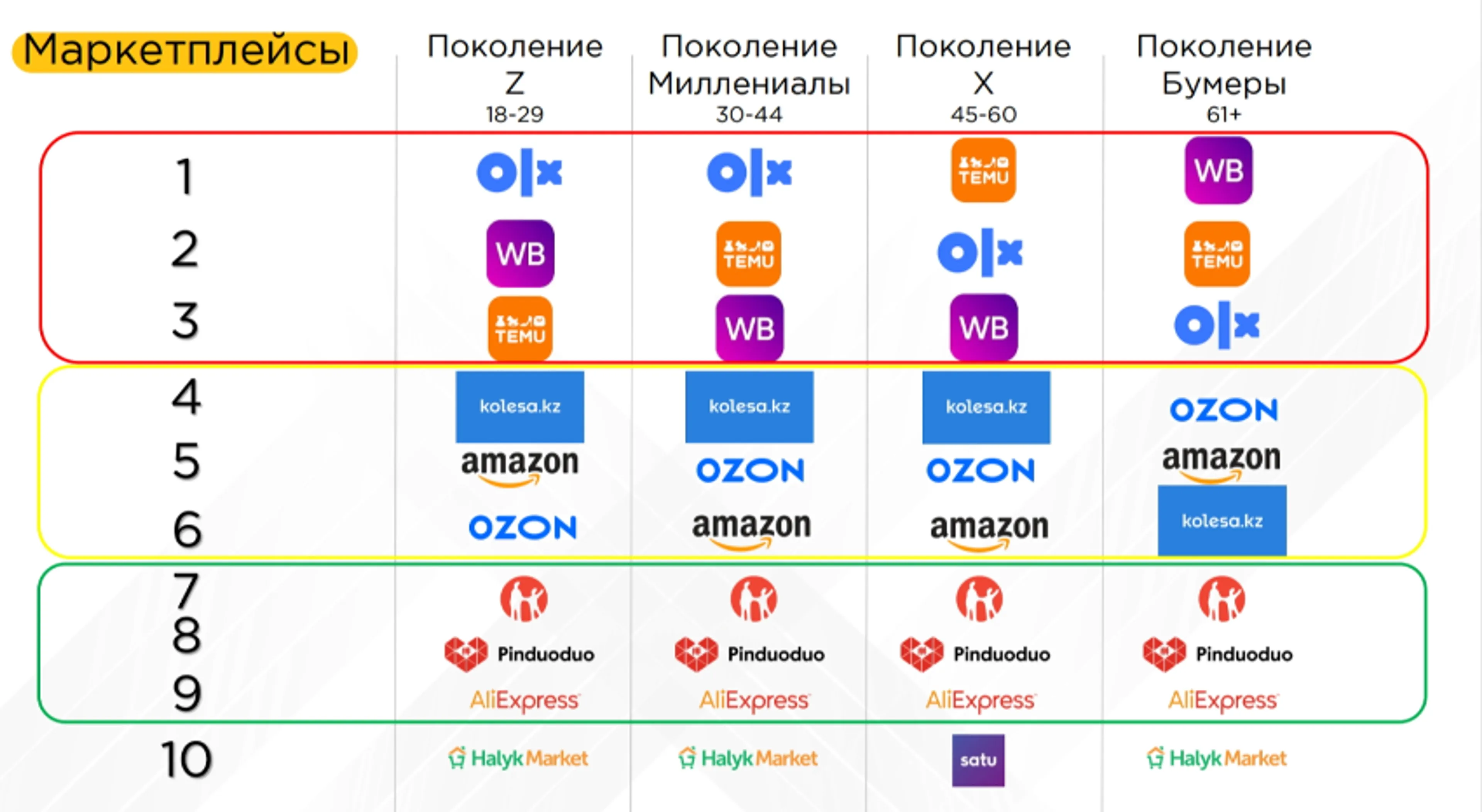 При этом Temu занимает №1 строчку у поколения X (45-60 лет), спускаясь до 3-й строчки среди Z (18-29 лет), тогда как Ozon наиболее популярен среди бумеров (старше 61) – четвертая строчка, и наименее популярен среди 18-29-летних – 6-я строчка рейтинга.