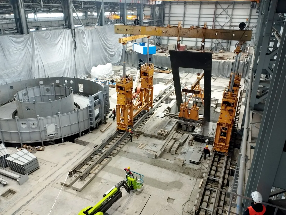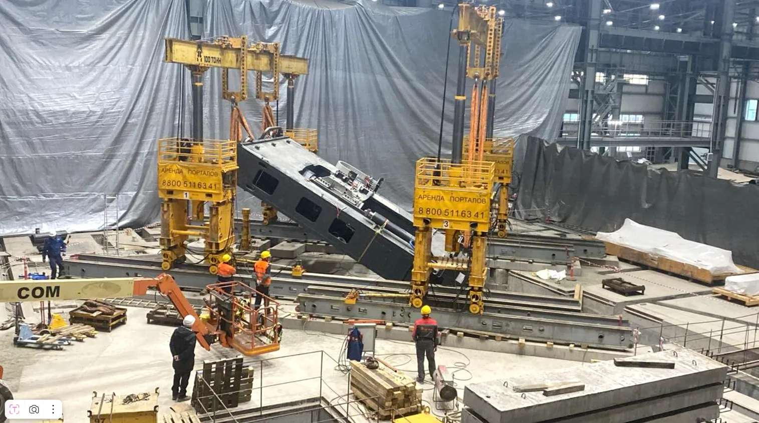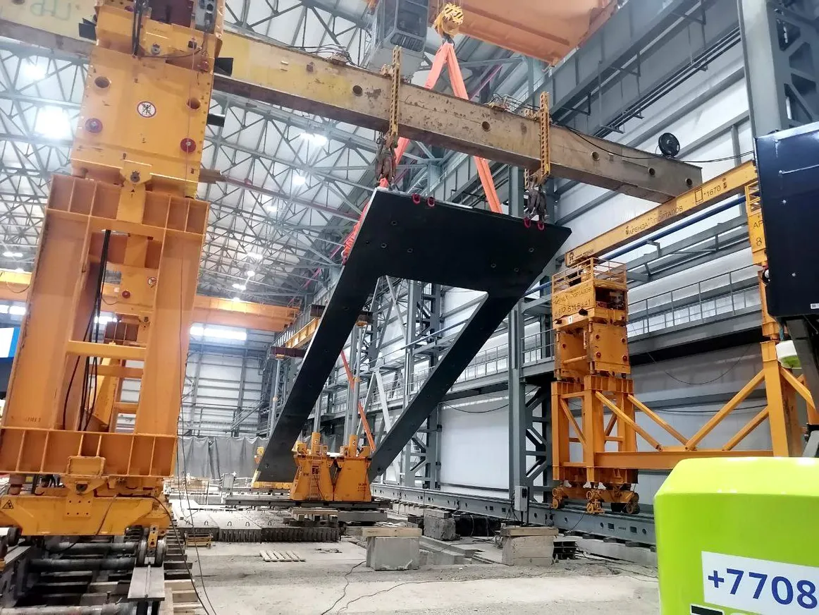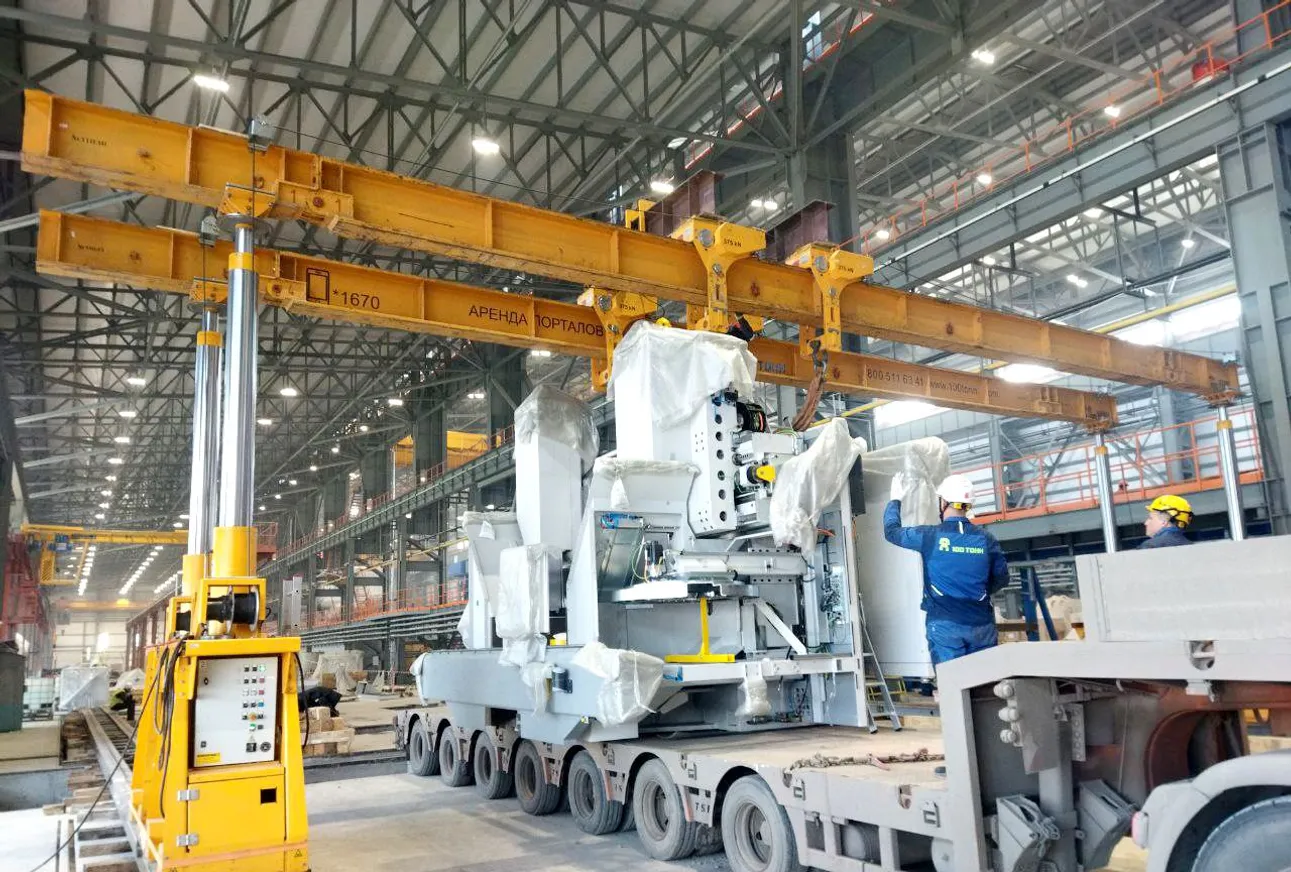 Более легкий ковочный пресс пришел на площадку практически в сборе. По цеху его транспортировали с помощью скиддинг-системы. Затем подняли, перевели в вертикальное положение и разместили на фундаменте с помощью портала грузоподъемностью 500 тонн.