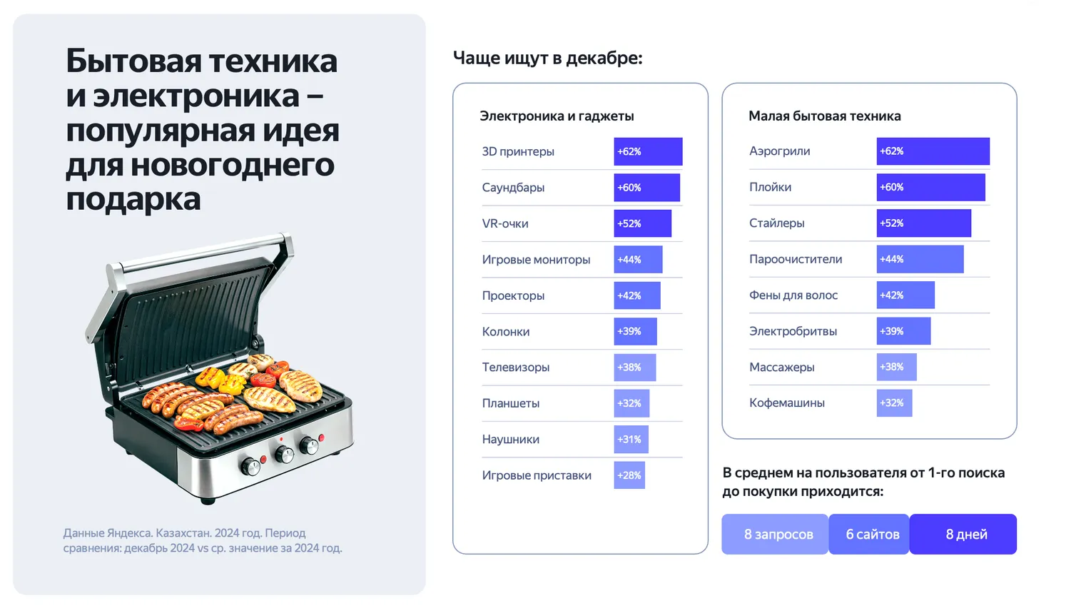 Близится главный праздник зимы, миллионы людей уже начинают искать подарки, рецепты и варианты досуга. Yandex Ads проанализировала данные за декабрь-январь 2024-2025 года, чтобы понять, что именно ищут казахстанцы в Яндекс Поиске в предновогодней суете. Кроме елок и адвент-календарей в топе оказались 3D-принтеры, саундбары и белый шоколад.
