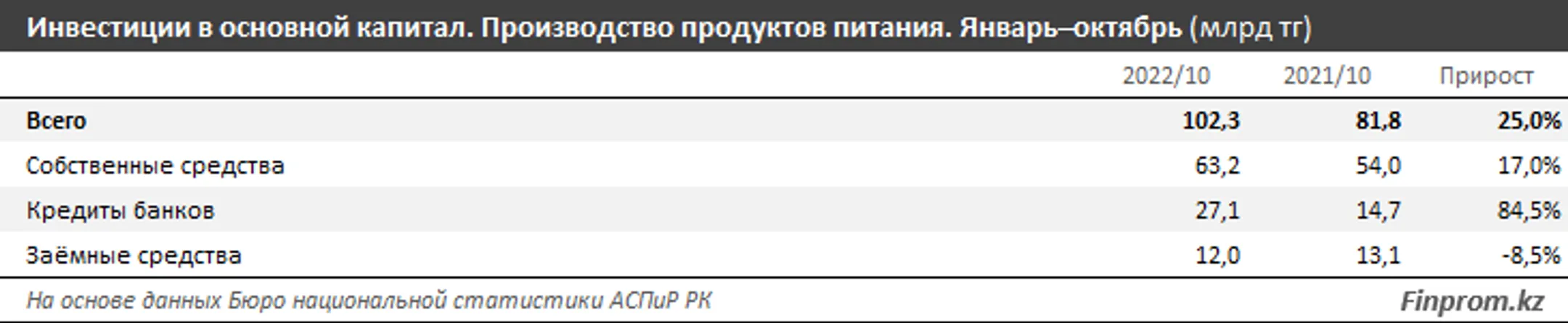 По итогам января–октября текущего года объем инвестиций в основной капитал в сфере производства продуктов питания достиг 102,3 млрд тенге — на 25% больше, чем годом ранее. Реальный рост физического объема инвестиций составил 21,1%.