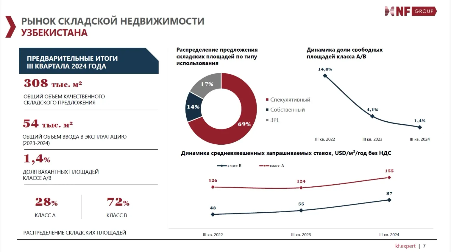 «Сегодня наши аналитики фиксируют спрос порядка 1 млн м² в регионе: на Казахстан приходится 400 тыс. м². Спрос формируется прежде всего маркетплейсами», – констатирует директор по работе с корпоративными клиентами NF Group.