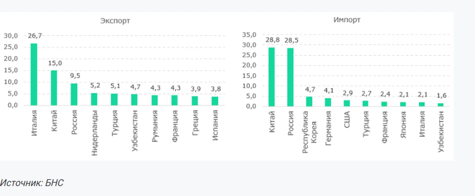По сравнению с аналогичным периодом прошлого года выросла доля Китая в импорте — с 25,7% до 28,8%. Впервые за долгий период Китай стал основным поставщиком импортных товаров, сместив с этой позиции Россию.