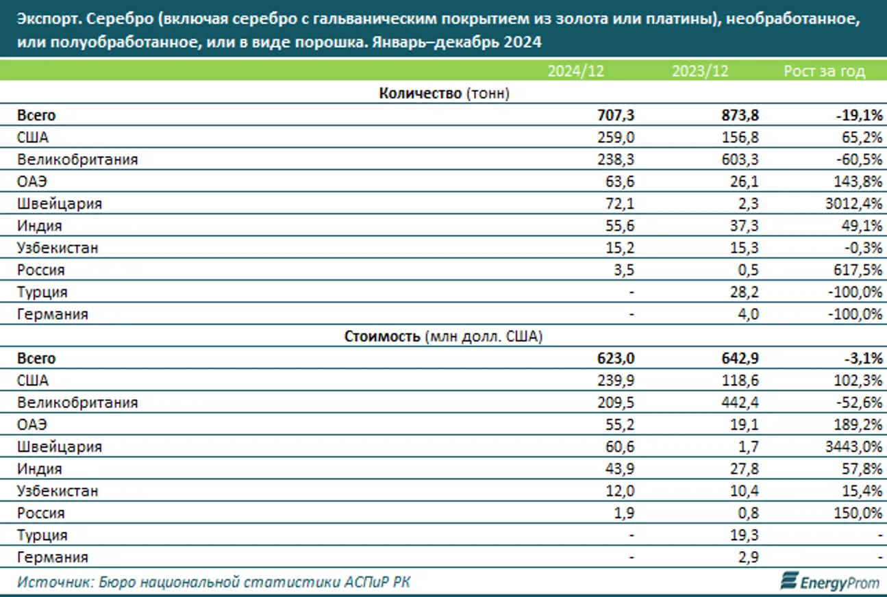 На экспорт за январь–декабрь 2024-го было отправлено 707,3 тонны необработанного или полуобработанного серебра — на 19,1% меньше, чем за аналогичный период предыдущего года.