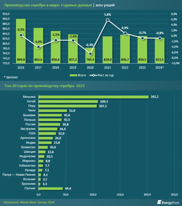 Показательный момент: производство серебра в мире также сократилось, хотя и не так заметно, как в Казахстане, а лишь на 0,8%. По предварительной оценке, мировой объем выпуска в 2024 году составил 823,5 млн унций серебра. Годом ранее также наблюдался незначительный спад: на 0,7%.