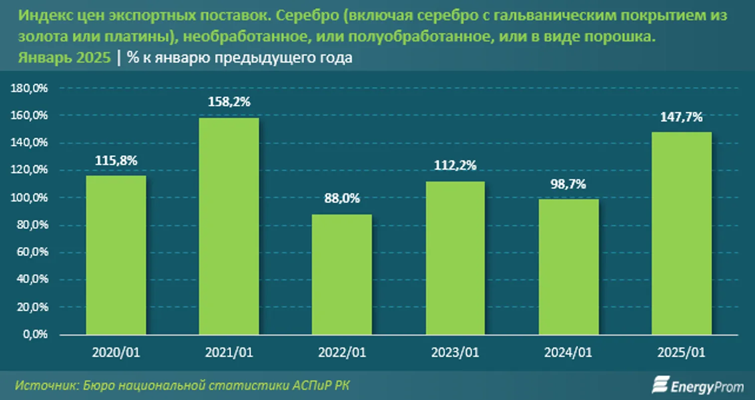Так, цены экспортных поставок серебра из Казахстана по итогам декабря прошлого года продемонстрировали годовой рост почти в полтора раза. В текущем году динамика сохранилась: в январе показатель вырос на 47,2% за год. Для сравнения: годом ранее цены экспортных поставок серебра, напротив, показывали снижение на 1,3%.