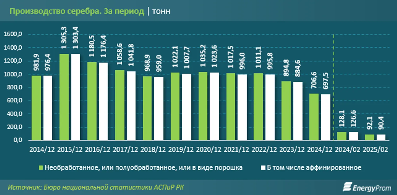 Для справки: в целом за январь–декабрь 2024 года в стране произвели 697,5 тонны аффинированного серебра — на 21,2% меньше, чем за соответствующий период 2023-го.