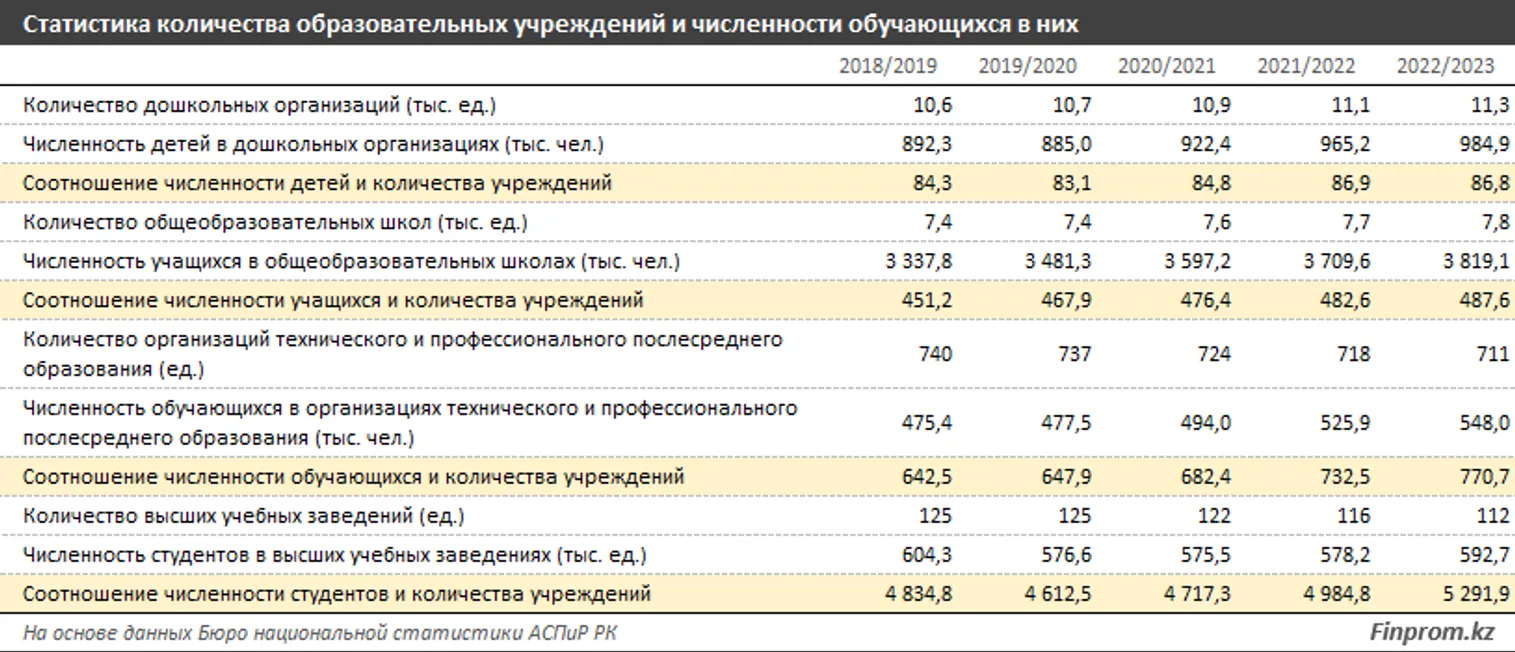 Основная часть образовательных услуг была оказана за счёт бюджета: 1,5 трлн тенге — на 10,8% больше, чем годом ранее. Объём услуг, оплаченных населением, вырос на 25,3%, до 236,5 млрд тенге. Ещё 49 млрд тенге (плюс 16,5%) было оплачено предприятиями.