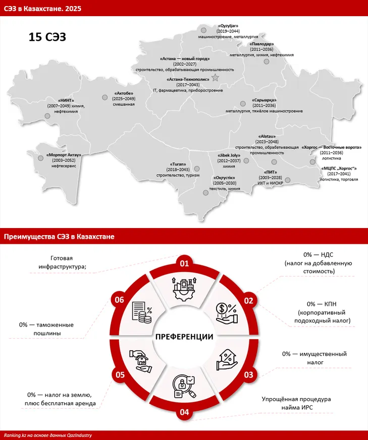 В Казахстане также создаются и развиваются специальные экономические зоны — не в таких масштабах, как в вышеупомянутых странах, но потенциал есть. Сейчас в РК действуют 15 СЭЗ. Каждая из них имеет отраслевую специфику, позволяющую фокусироваться на определённых перспективных сферах экономики. В СЭЗ Казахстана так же, как и в мире, действуют свои законы и нормы. Отметим несколько основных преимуществ для участников СЭЗ: