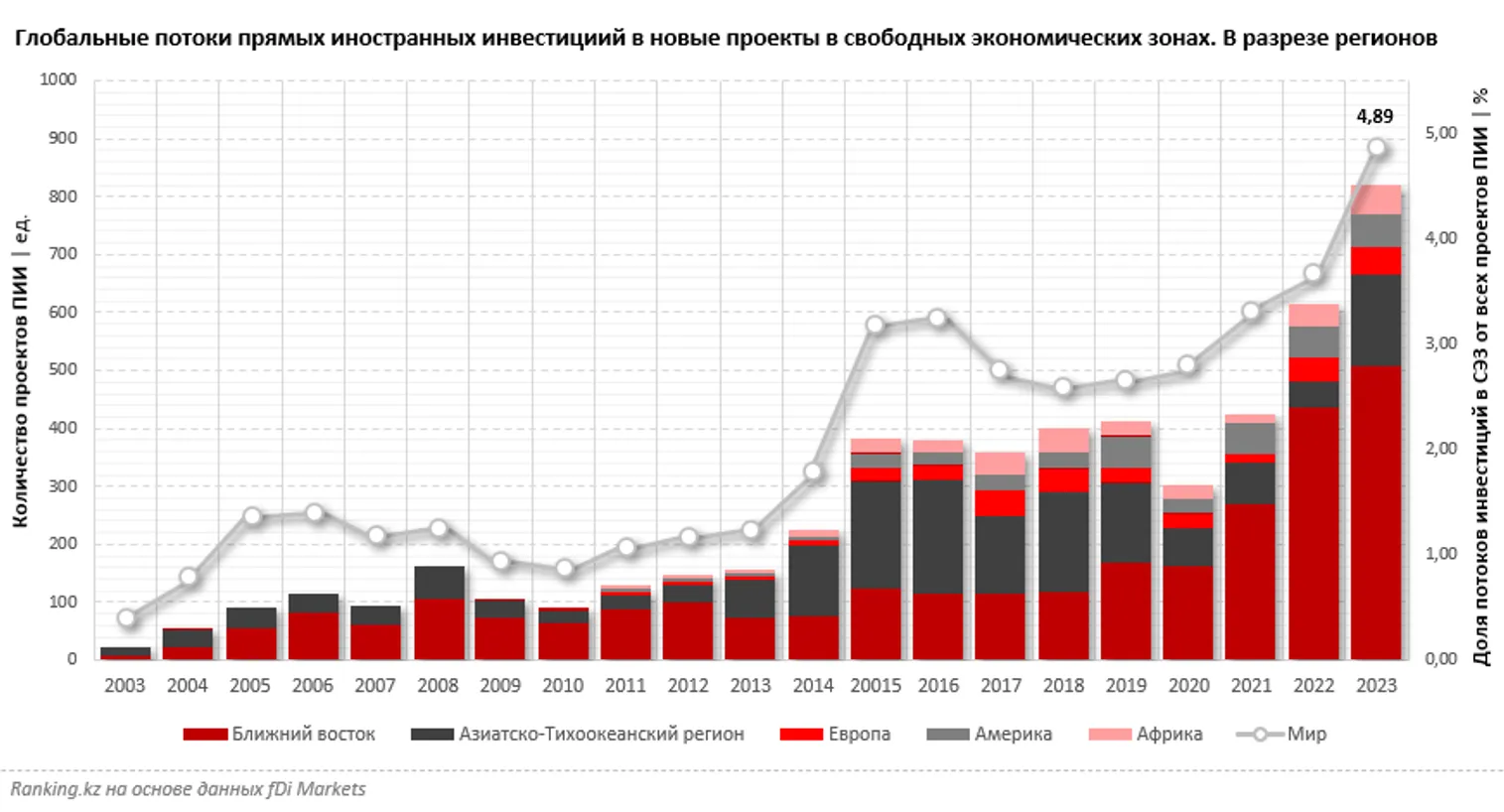 По последним данным, за полный 2023 год потоки прямых иностранных инвестиций (ПИИ) в эти специальные экономические зоны продемонстрировали исторический рекорд, достигнув почти 5% от всех проектов, привлекающих ПИИ в мире. Для сравнения: в 2022 году их доля составляла 3,7%, в 2021-м — 3,33%, а в 2017–2020 годах она варьировалась в пределах 2,6–2,8%.