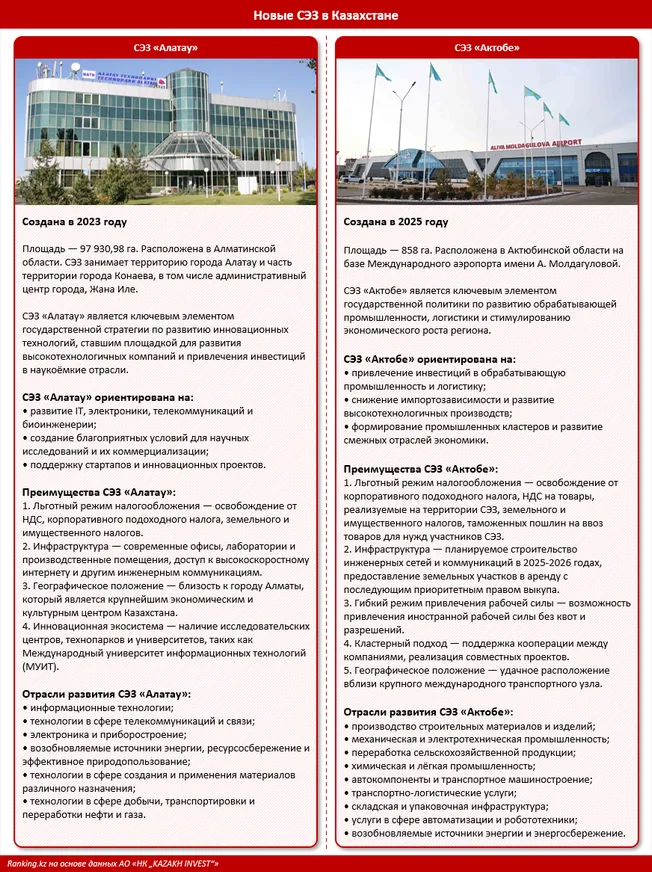 Сегодня в стране можно отметить две новые СЭЗ: СЭЗ «Алатау», созданную в 2023 году; СЭЗ «Актобе», созданную только в текущем году.