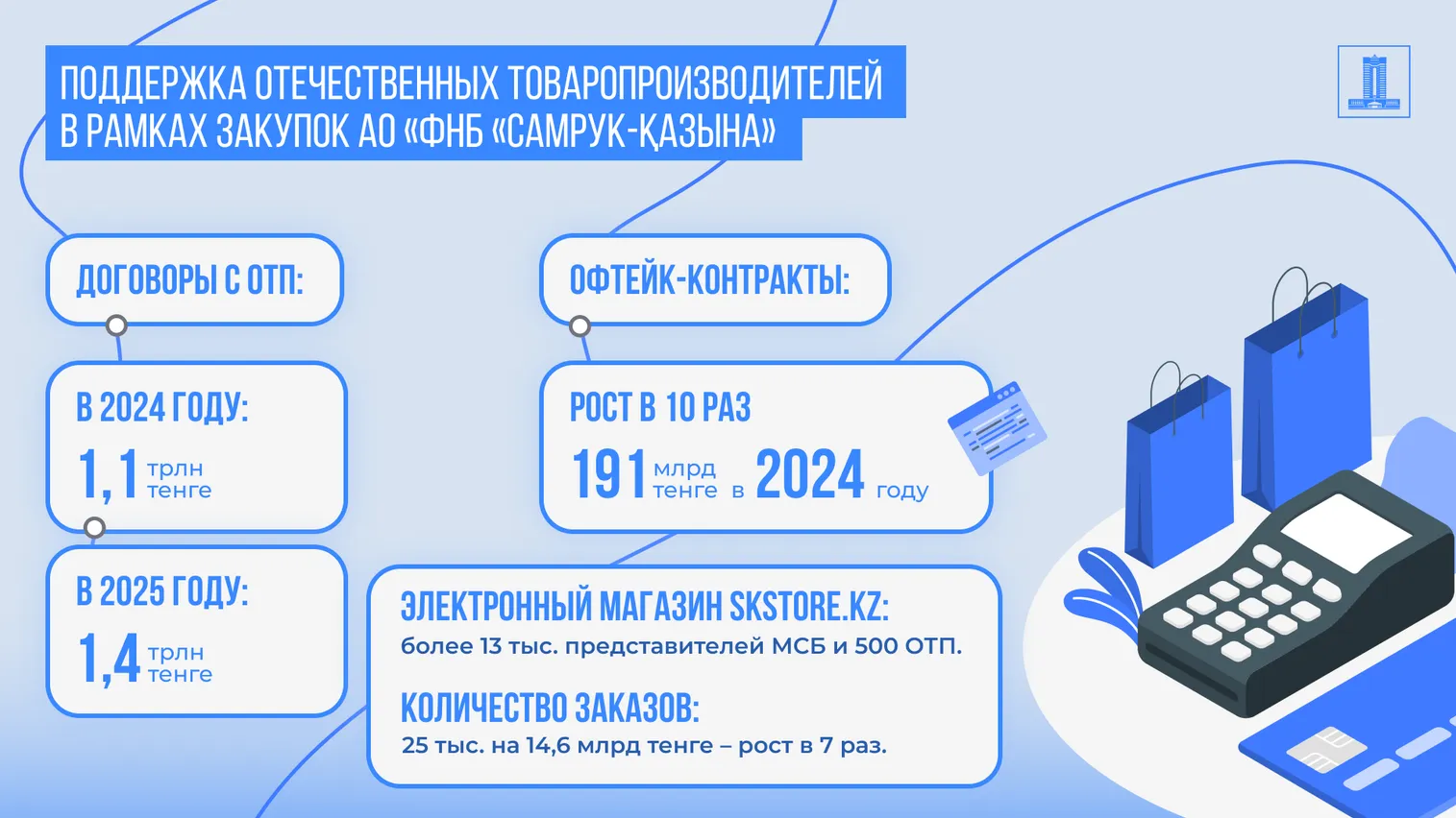 По программе импортозамещения в прошлом году «Самрук-Қазына» заключил с казахстанскими предпринимателями офтейк-контракты на 191 млрд тенге — рост в 10 раз. Одной из мер поддержки бизнеса является электронный магазин skstore. kz. На платформе зарегистрировано более 13 тыс. представителей МСБ и 500 отечественных товаропроизводителей. По итогам 2024 года количество заказов составило 25 тыс. на сумму 14,6 млрд тенге, рост по сравнению с 2023 годом – в семь раз.